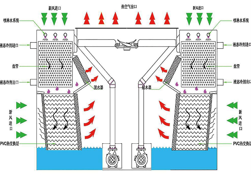 閉式冷卻塔是一種閉式冷卻器,應用于制造工業領域,需要用水進行冷卻的設備很普遍,傳統的水冷方法水耗大,運行和使用設備的維護費用高,不符合環保節能的運行方略。該冷卻塔的工作流體封閉式循環、用紫銅管、鋁翅片等作為導熱體,通過空氣進行換熱。使用閉式冷卻塔的顯著特點是無水垢,不結水垢(循環水質穩定),換熱效率高,運行費用低。
